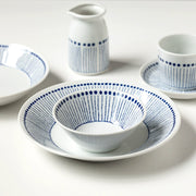Elegant and stylish blue and white dotted rim dinnerware set. Featuring a charming design, these ceramic bowls and plates are perfect for everyday dining or special occasions. Made from high-quality materials, these pieces are durable and easy to care for.