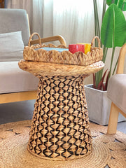 Environmentally conscious and sustainable, this brown and black straw table is a perfect choice for those looking to add a touch of elegance and texture to their living space. Please note that this table is not suitable for sitting and is intended for indoor use only.
