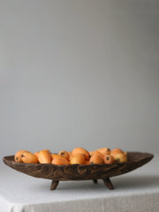 Hand-carved wooden bowl with a unique, textured finish, perfect for displaying fresh fruit, snacks, or decorative items. The dark brown color and sturdy legs add a touch of rustic charm to any room. A beautiful handcrafted piece.