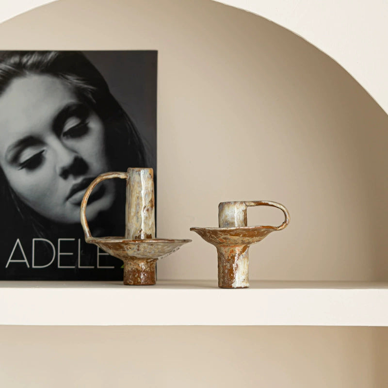 Guinon Aroma Series Ceramic Candlestick Holder with Handle - Rustic Vintage Style - Brown kiln-changed candle holder, short style